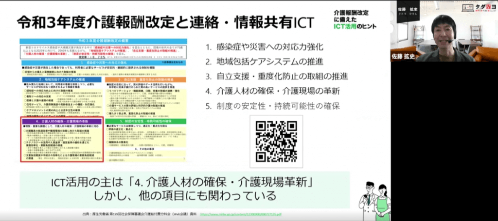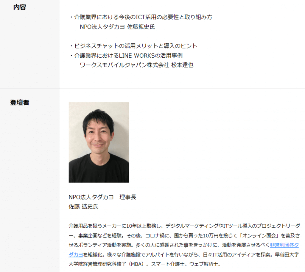 この度、ワークスモバイルジャパン株式会様が主催する介護報酬改定に備えたICT活用セミナーに登壇させて頂きました。令和3年度の介護報酬改定をきっかけにICTの重要性が一層高まっています。介護事業所のICT活用の成功を切に願っています。貴重な機会を下さったワークスモバイルジャパン様、ありがとうございました!