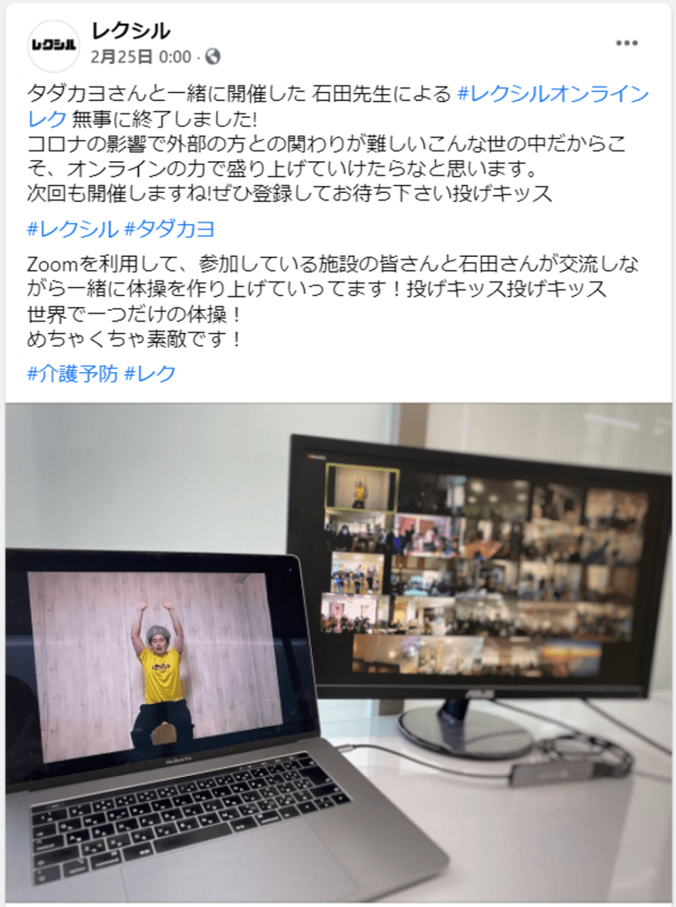 2021年2月23日 / 最終更新日 : 2025年12月4日 ヒロス タダレク:無料オンラインレク 2/23 レクシル様と一緒に高齢者施設向け無料オンライン体操レクイベントを開催しました。 この度、オンラインレクサービスを提供するレクシル様と一緒にオンライン体操レクイベントを開催しました。主催のレクシル様、介護エンターテイナー石田竜生様、ありがとうございました! 当日の様子 *出典:レクシル様フェイスブックページ