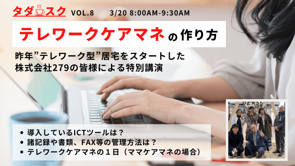 3月20日のタダスクは、株式会社279 居宅介護支援事業所「つなぐ手ケアマネセンター」様より、「テレワークケアマネの作り方」についてお話いただきました。