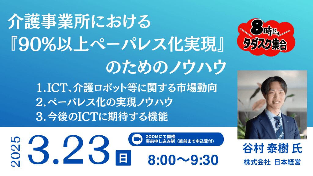 【3/23開催】介護事業所における『90%以上ペーパレス化実現』のためのノウハウ~8時だョタダスク集合!~