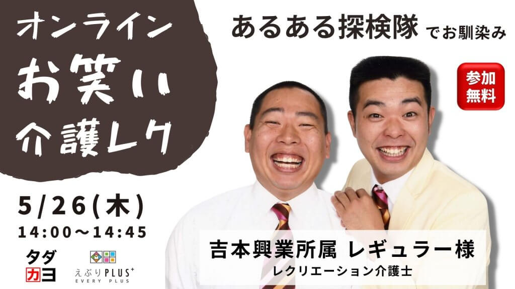 受付終了【5/26 開催】あるある探検隊でお馴染みのレギュラー様による「無料オンラインお笑い介護レク」