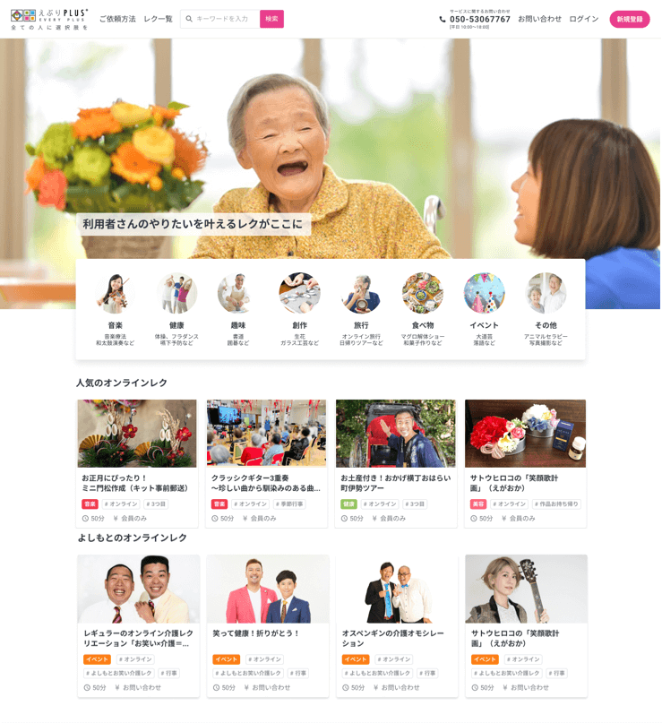 エブリ・プラスは介護施設向けに約300種類以上から、訪問・オンラインから選べるイベントや教室、体験を選べるプラットフォームです。