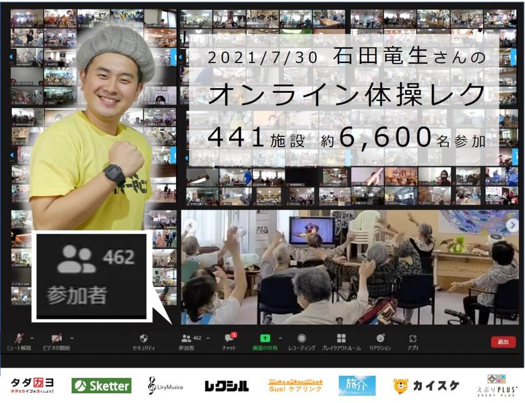 この度、①自粛生活が続く高齢者に楽しみを届けたい、②介護事業所のZoom活用のきっかけを作りたいという想いから、第9回目の無料オンラインレクを開催しました。今回は、オンライン体操レク開催し、全国441施設、約6,600名の方にご参加頂きました。非営利イベントの趣旨に共感し協力して下さった介護エンターテイナー石田さま、本当にありがとうございました!
