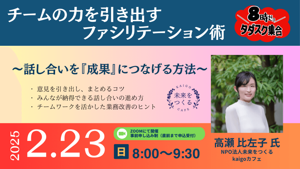 今回は、NPO法人「未来をつくるkaigoカフェ」代表の 高瀬比左子氏 を講師に迎え、 話し合いがスムーズに進むコツ を学びます!