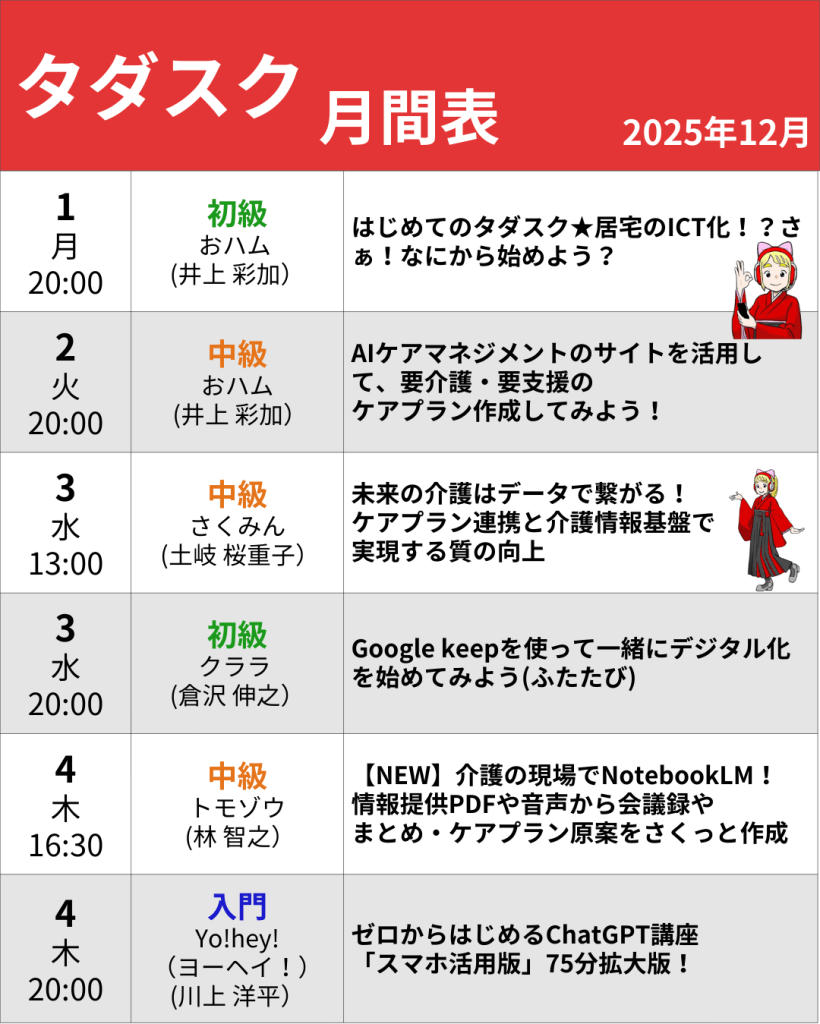 | 12/2(火) 20:00 | 中級 | おハム | AIケアマネジメントのサイトを活用して、要介護・要支援のケアプラン作成してみよう! |