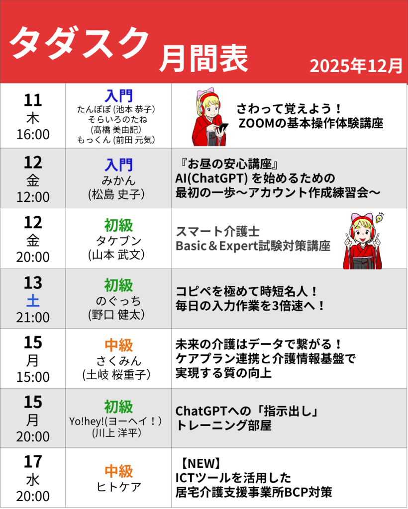 今年も残りわずか!12月のタダスクは、初心者の方から上級者まで役立つ、業務効率化、AI活用、そして冬のイベントまで盛りだくさんのラインナップでお届けします。
