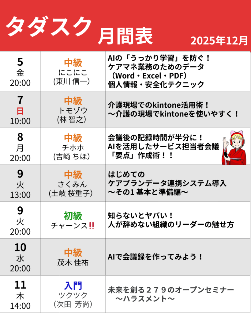 | 12/8(月) 20:00 | 中級 | チホホ | 会議後の記録時間が半分に!AIを活用したサービス担当者会議「要点」作成術! |