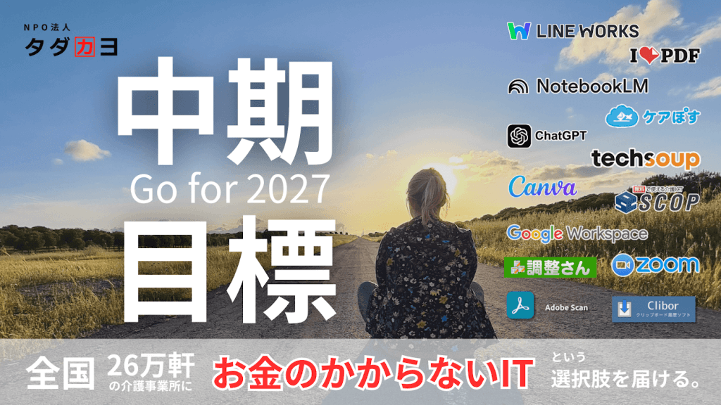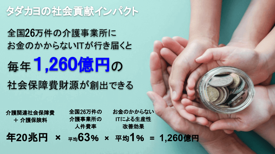 「全国26万軒の介護事業所に、お金のかからないITという選択肢を届ける。」 この目標達成は、日本の社会貢献インパクトに繋がると信じています。
