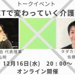 2020年12月16日 / 最終更新日 : 2025年12月4日 ヒロス お知らせ・活動報告 12/16 みんなのIT協会様主催トークイベントに参加しました。 この度、みんなのIT協会様主催トークイベントに登壇させて頂き、「ITで変わっていく介護」というテーマで対談させて頂きました。みんなのIT協会城谷様、ありがとうございました!