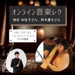 2021年3月30日 / 最終更新日 : 2025年12月4日 ヒロス タダレク:無料オンラインレク 受付終了【4/13開催】無料オンライン音楽レク 神谷知佐子さん(ハープ)、鈴木豊大さん(パーカッション) 新型コロナウイルスが依然猛威を振るう中、高齢者の命と生活を守るために働かれている医療介護従事者の皆様に心から感謝を申しあげます。 この度、自粛生活を余儀なくされている皆さまにお楽しみ頂けたらという想いから、オンライン音楽 […]