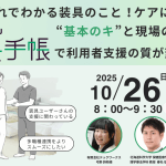 2025年9月25日 / 最終更新日 : 2025年12月4日 八木 8時だョタダスク集合! 【10/26(日)朝8時~】8時だよタダスク集合!これでわかる装具のこと!ケアに活かす“基本のキ”と現場のヒント〜デジタル装具手帳で利用者支援の質が変わる!〜 介護に関わる仲間と共に学び、繋がる朝活コミュニティ「8時だヨタダスク集合」 10月は「装具」をテーマに、利用者さんの日常を支えるための知識と最新の取り組みを学びます。「利用者さんが使っている装具、実はよく分か […]