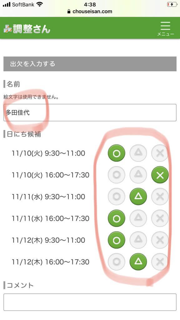 ③名前を入力し、出席可否を〇△×で回答する。