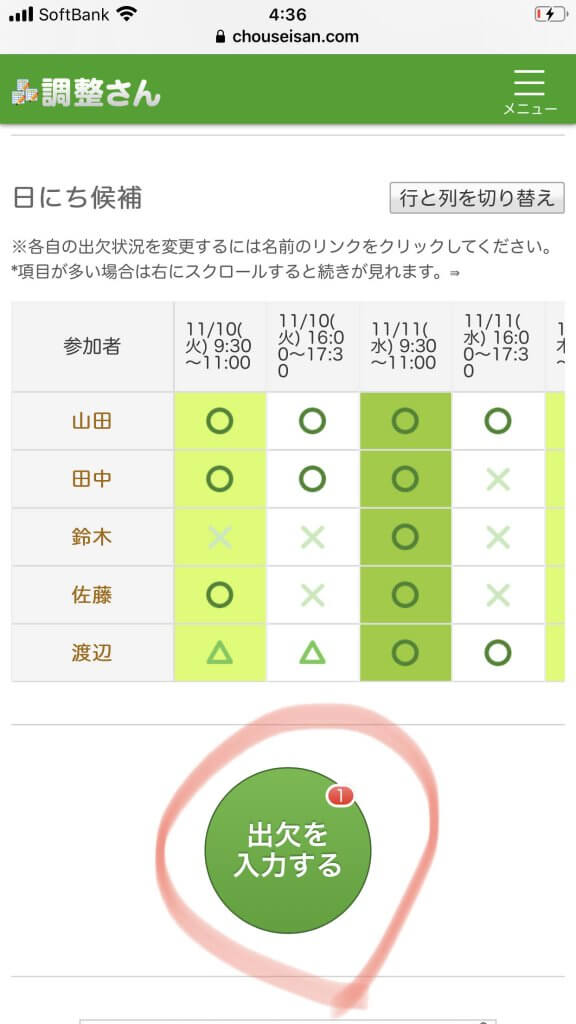 ②「出欠を入力する」をタップする