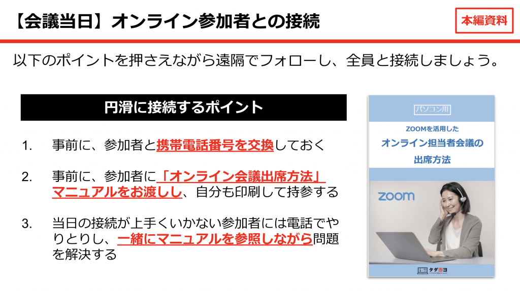 そこで今回の資料集には、パソコン、タブレット&スマホ用の 出席者マニュアルも用意しておりますのでこちらもご活用ください。