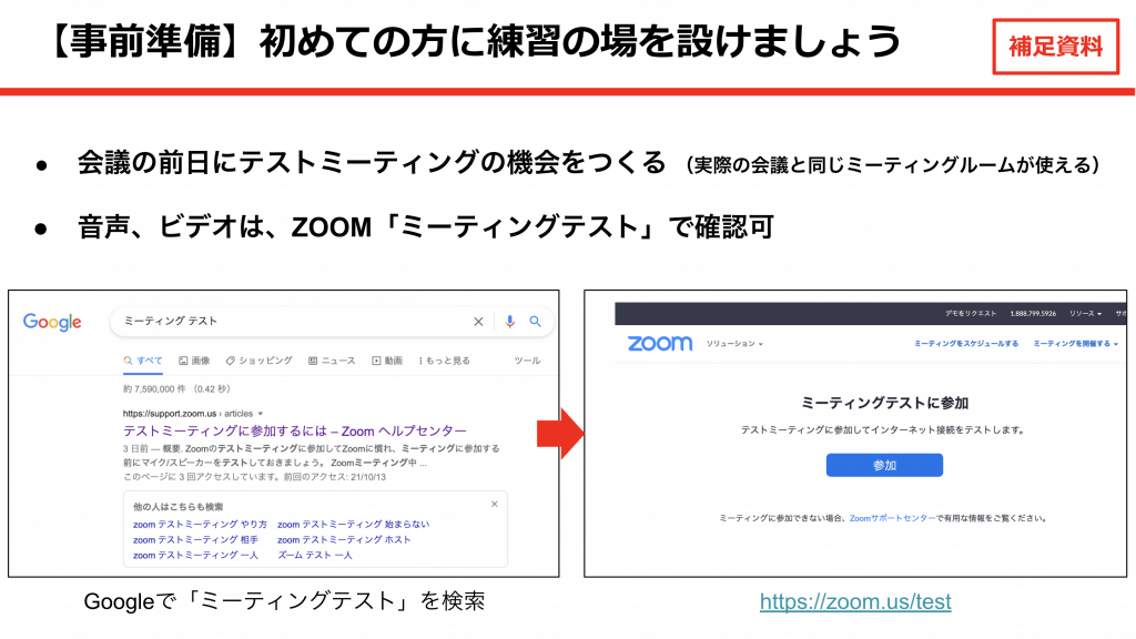 またZOOM公式の「ミーティングテスト」もあり、音声、ビデオなどの品質を確認することができます。接続先は無人なので気軽に何度でもトライできます。 過去の記事もご参考ください。