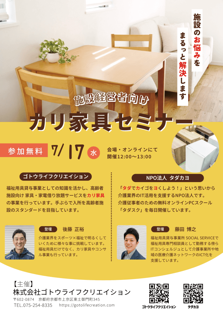 京都市の福祉用具貸与事業所である株式会社ゴトウライフクリエイションが提供する「カリ家具」により、レンタル家具家電サービスを活用して空き部屋を即回転させる方法や、タダカヨの無料オンラインレク「タダレク」および無料オンラインPCスクール「タダスク」を通じて、施設生産性を向上させるための実践的なアドバイスを提供いたします。