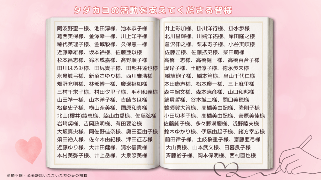 金銭的な支援だけでなく、タダカヨのロゴを身に付けることで繋がりを感じ、一員として日々活動できます。その収益が活動費に充てられ、さらにタダカヨの輪を広げるエネルギーとなります。
