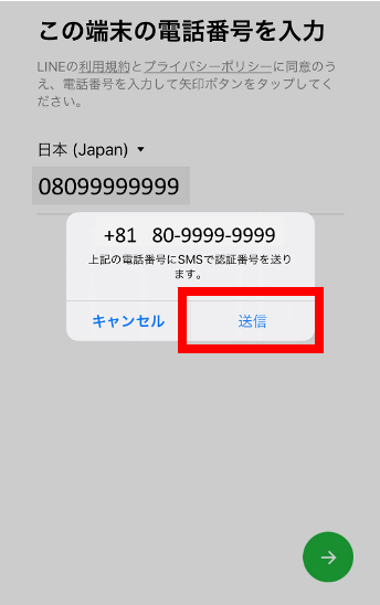 6.ご自身の携帯電話番号を入力し、「→」を押す。