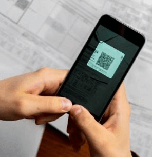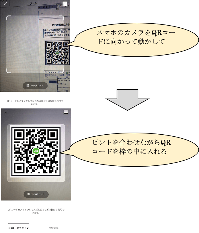 4.スマートフォンのカメラが動き始めたら、施設・病院から別途案内があった正方形の記号(QRコード)を画面の枠の中に入れる。その際、スマートフォンを上下に動かしてピントを合わせる。