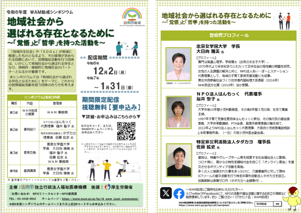 令和6年度 WAM助成シンポジウム「地域社会から選ばれる存在となるために~「覚悟」と「哲学」を持った活動を~が開催されます。