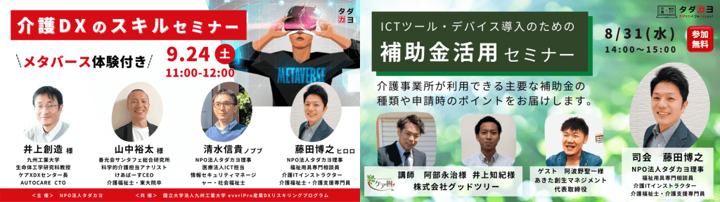 8-9月は、介護・福祉業界ではほとんど前例がない”メタバース”を活用した「介護DXのスキルセミナー」や、介護業界では未だ活用が限定的な「補助金」を使ってICT化するための「補助金活用セミナー」も開催しました。両セミナー合わせて、108名の介護従事者が参加され、参加者から高いご評価を頂きました。