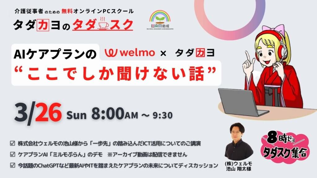 3月26日の8時だよタダスク集合では、(株)ウェルモ池山翔太様をお招きし「AIケアプラン”ここでしか聞けない話”」を講演していただきました。参加者は過去2番目に多い97名、日曜日の朝8時からAIケアプランについて熱いお話を聞くことができました。