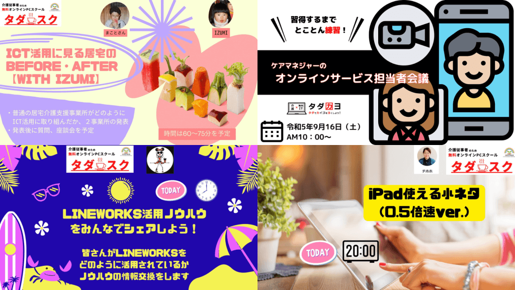 タダスクでは、介護に従事しているPCスキルやICTに詳しい講師17名が月に25回程度、オンラインでのスクールを開催し、受講者に今まで培っていたスキルやノウハウを実際にデモ画面を通して説明したり一緒に実践型で体験したりしています。定期的に通われてる方は「どんどんスキルが上がり業務が効率化できた」というお話が聞けてとても嬉しく思っております。