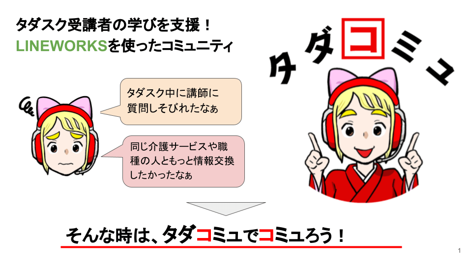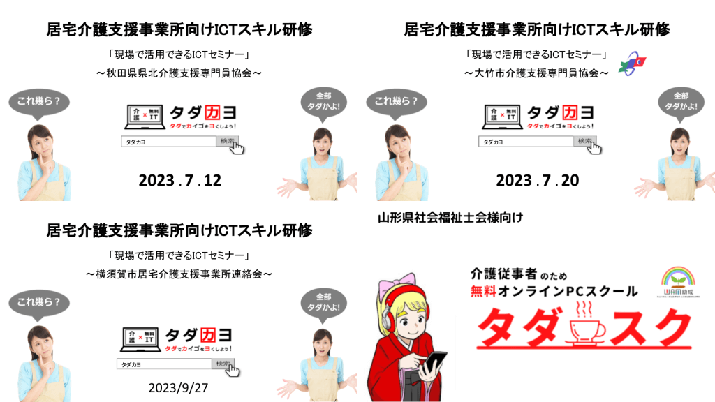 また、タダカヨは、講師料は原則お断りし、少しでも多くの介護従事者にICT活用ノウハウをお届けするように努めています(一部、寄付扱いで謝礼を頂く場合もあります)。