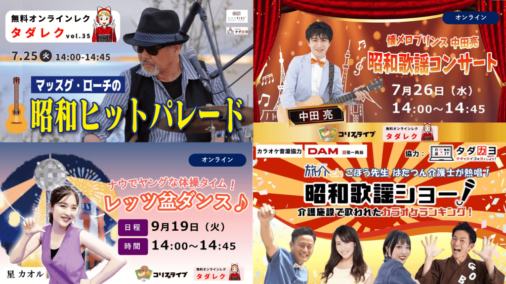 タダレクでは、高齢者施設やデイサービスで、昼食後の14時から14時45分の間にオンラインでのレクリエーションの活動を行っています。オンラインでつながった利用者さんたちは、歌やダンスなどのパフォーマンスを楽しみにしてくださり、当日に向けて、うちわを作ったり飾りをつけたりするなど、準備も一生懸命にされています。オンラインならではの臨場感があり、主催者や利用者さん、職員とのコミュニケーションを通して、一方向のテレビなどとは違い相互交流でしか味わえない感動もありました。また、職員さんもお忙しい中、オンラインツールや利用者さんを楽しませようと準備くださり本当にありがとうございました。