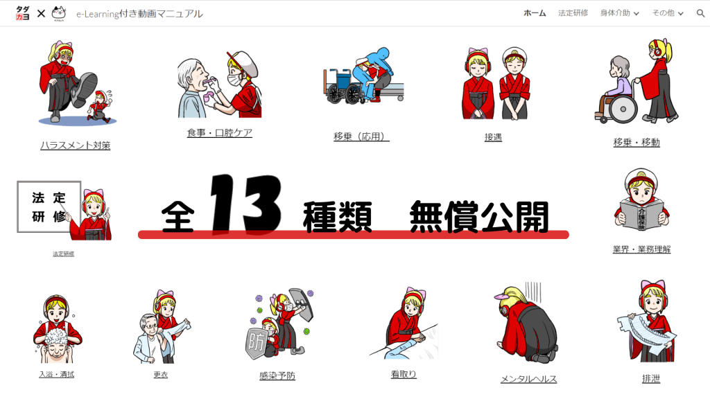 そこで、タダカヨは、この度、ケアきょう様ならびに介護現場と介護教育の有識者である高橋先生とともに、介護施設向け”無料動画マニュアルサイト”開発しました。youtube上の有益な介護教育動画とGoogleの各無料ツールを組み合わせて、スタッフ教育用のe-lerningシステムとして使えるサイトです。