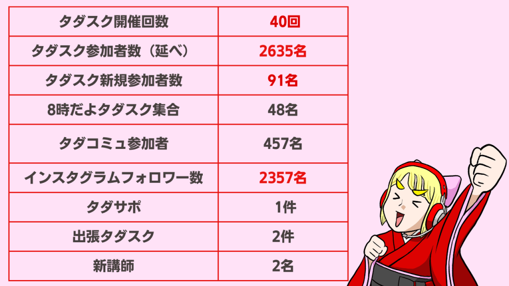 多くの方にタダスクにご参加いただき、リピーターの方も多数いらっしゃることは、私たちの活動への大きな励みとなります。