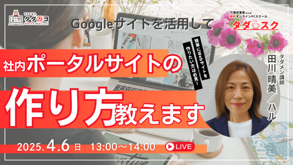 4/6(日)13:00(中級)ハル流・Googleサイトを利用した社内ポータルサイトの作り方(ハル) 「社内ポータル、もっと見やすくしたい…」Googleサイトで簡単社内ウェブサイト作成:Web制作の知識がない方でも、Googleサイトを使って簡単に情報共有できる社内ポータルを作成する方法をご紹介しました。