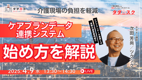 タダスクは、全国各地の介護事業所や職能団体と連携した「出張タダスク」の開催、無料ICTサポート「タダサポ」の強化、地域包括支援センター向けや特定の業務に特化した新コースの開設などを計画しており、今後もより多くの介護従事者のスキルアップを支援してまいります。