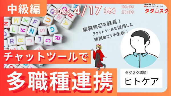 4/17(木)20:00(中級)チャットツールで自律的な多職種連携を実現しよう!(ヒトケア) 「連携がうまくいかず、情報共有に時間がかかる…」チャットで実現!介護現場の多職種連携術:チャットツールを活用したスムーズな情報共有のコツや導入の注意点、活用事例をご紹介しました。