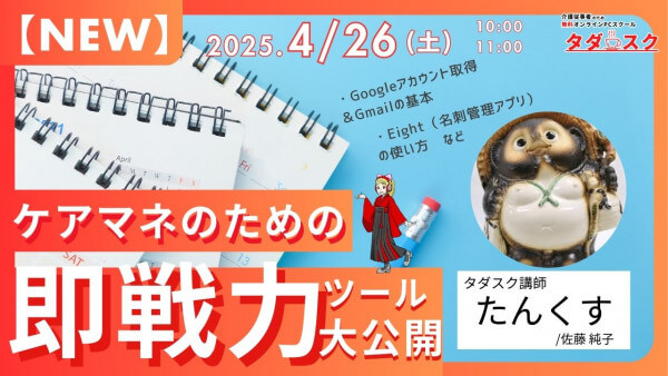 4/26(土)10:00(初級)【NEW】IT苦手でも安心!即戦で使えるケアマネのための便利ツール入門講座(たんくす) 「ITが苦手で、何から始めたらいいか分からない…」ケアマネさんのための便利ツール入門:GmailやGoogleマップなどの基本操作から、業務効率化に役立つ便利ツールまで、ITが苦手な方でも安心して学べる内容をお届けしました。