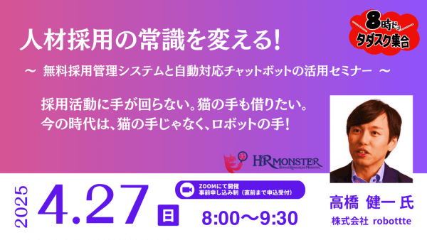 4月27日(日)に開催された早朝オンラインセミナー「8時だよタダスク集合!」では、株式会社robottteの高橋健一氏を講師にお迎えし、「人材採用の常識を変える!」をテーマに、介護現場における人材確保の新たなアプローチについて考えました。