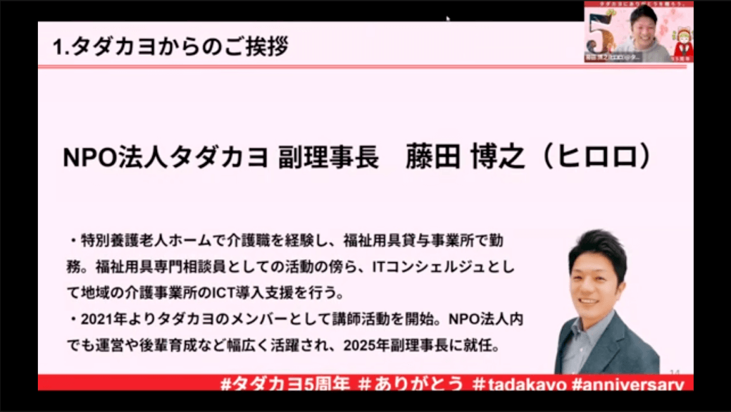 感動的なオープニングを経て、活動を支えてきた副理事長ヒロロさんからは、タダカヨ創設の背景や5年間で感じた変化について、心に響く貴重なお話をいただきました。