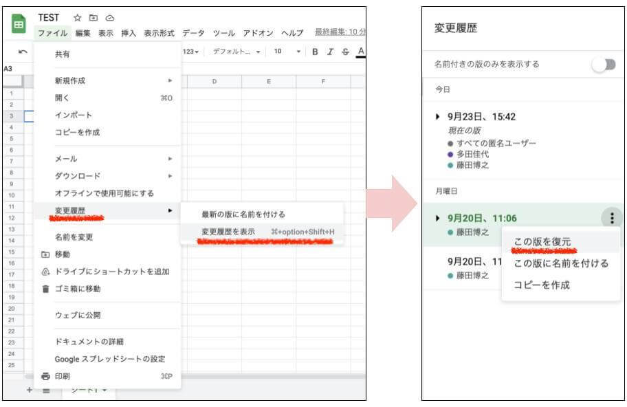 もしあなたが作成したファイルを共同編集者が誤って操作してしまったとしてもスプレッドシートなら問題ありません。変更履歴から元のファイルに復元することが可能です。
