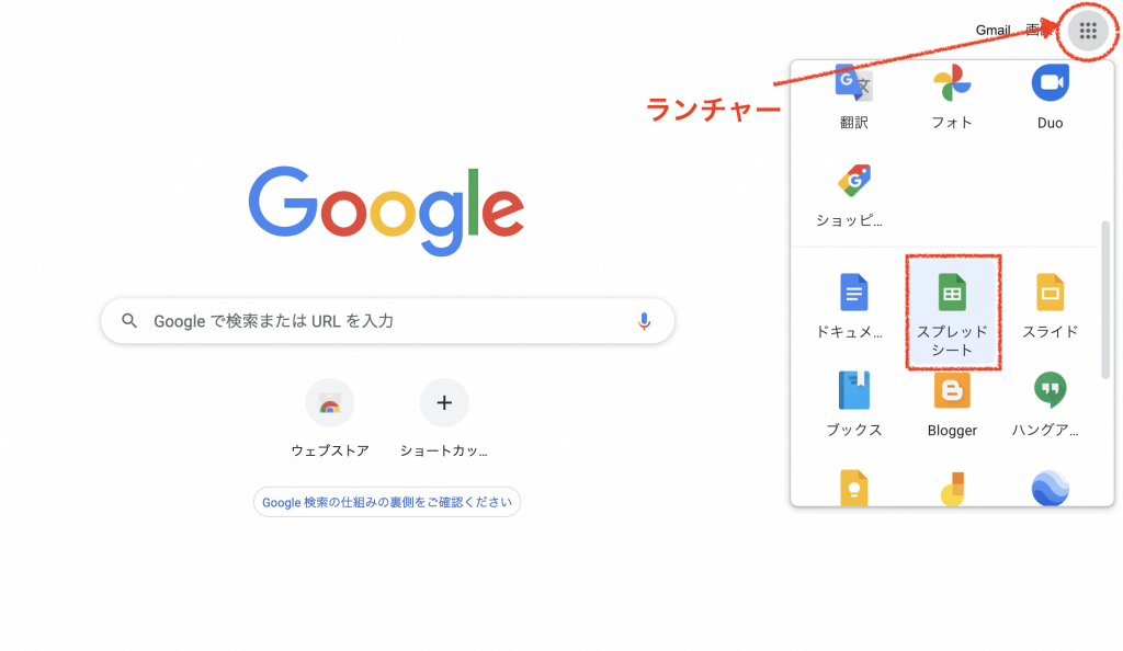 - まずはGoogleChromeなどのブラウザからGoogleの検索画面の右上”ランチャー”からスプレッドシートを選択します。