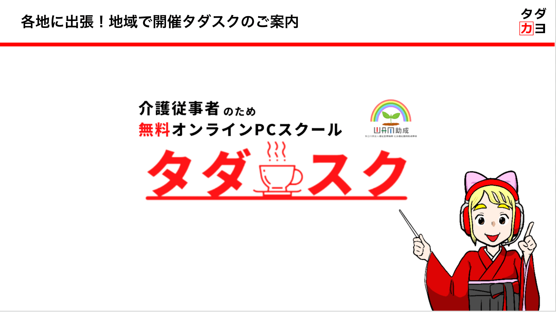 タダカヨでは介護業界向けに無料のオンラインPCスクール「タダスク」をほぼ毎日開催しております。