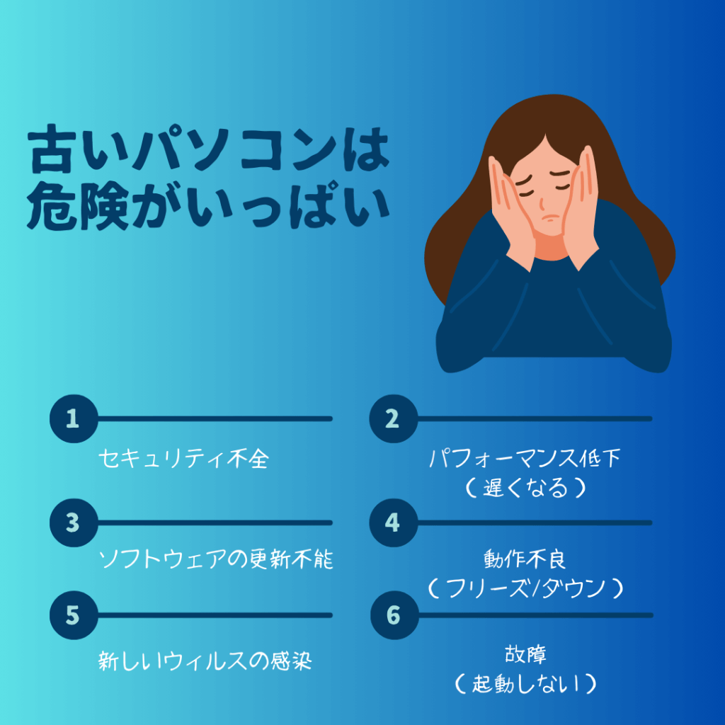 古いパソコン(PC)を使用し続けることは、業務効率の低下だけでなく、
