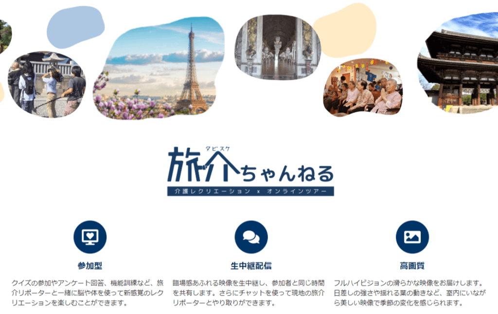 旅介ちゃんねるは、介護施設にいながら旅行気分を味わえるレクリエーションです。