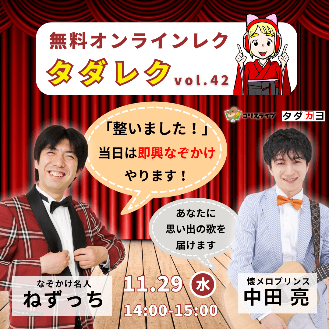 受付終了【11/29開催】「整いました!」ねづっち様による即興なぞかけ ×中田亮様の昭和歌謡コンサート タダレクVol.42