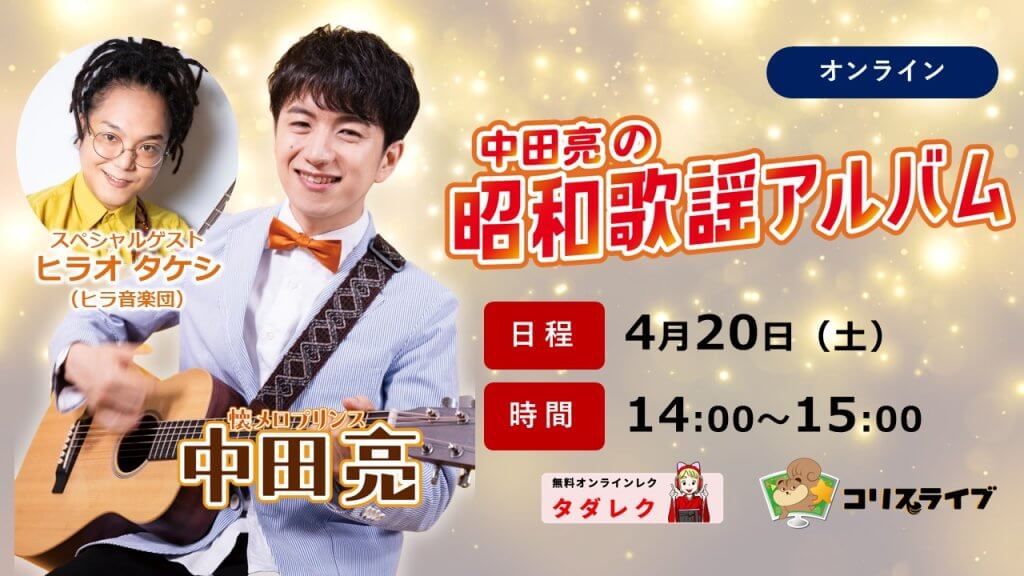 懐メロプリンス中田亮が、自身の音楽仲間と一緒に、昔なつかしい「昭和歌謡曲」をお届けいたします。
