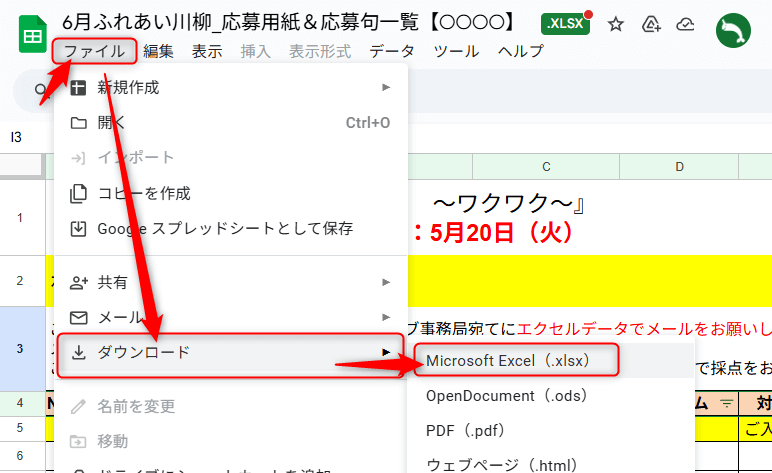 「ファイル」>「ダウンロード」>「Microsoft Excel(.xlsx)」