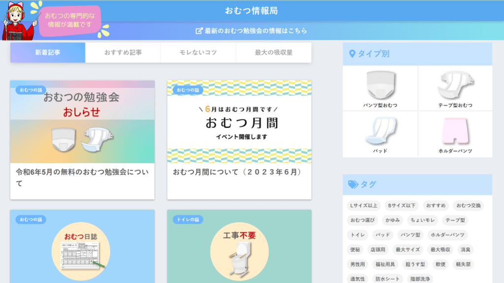 おむつ情報局さんは、大人用おむつの種類や選び方について情報を提供するサイトです。サイトでは、各種おむつの基本知識、交換方法、吸収量、サイズの選び方、漏れ防止のコツなどを紹介しています。また、関連用品やトイレに関する情報も充実しています。さらに、無料のおむつ勉強会の案内や、各メーカーの交換方法の動画も提供しており、実用的な情報が満載です。詳細はサイトをご覧ください。