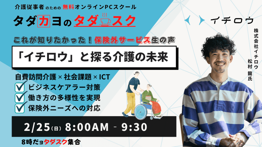 受付終了【2/25開催】これが知りたかった!保険外サービス生の声 「イチロウ」と探る介護の未来 ~8時だョタダスク集合!~