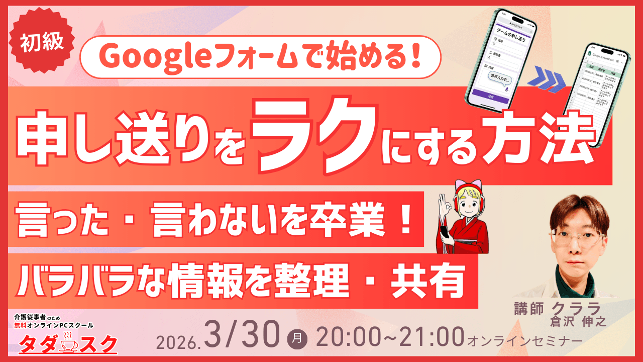 • 得られる未来: 朝のルーティンや書類作成の手間が劇的に減り、PC操作への苦手意識が「サクサクこなせる自信」に変わります。事務作業のイライラから解放されることで、利用者様と向き合うための大切な時間と心のゆとりが生まれます。