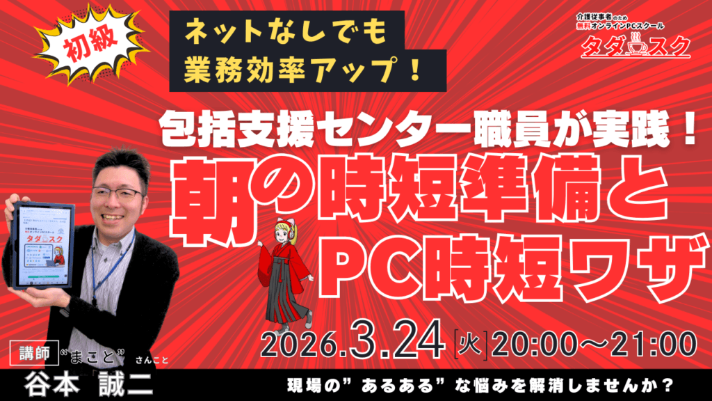 • 講座の内容: 地域包括支援センターの現役職員が実践する、PC起動時に必要なソフトを自動で開く「魔法の設定」や、読めない漢字の入力法、Wordの範囲選択など、ネット不要で明日から使える6つの時短ワザをゆっくり丁寧に解説します。