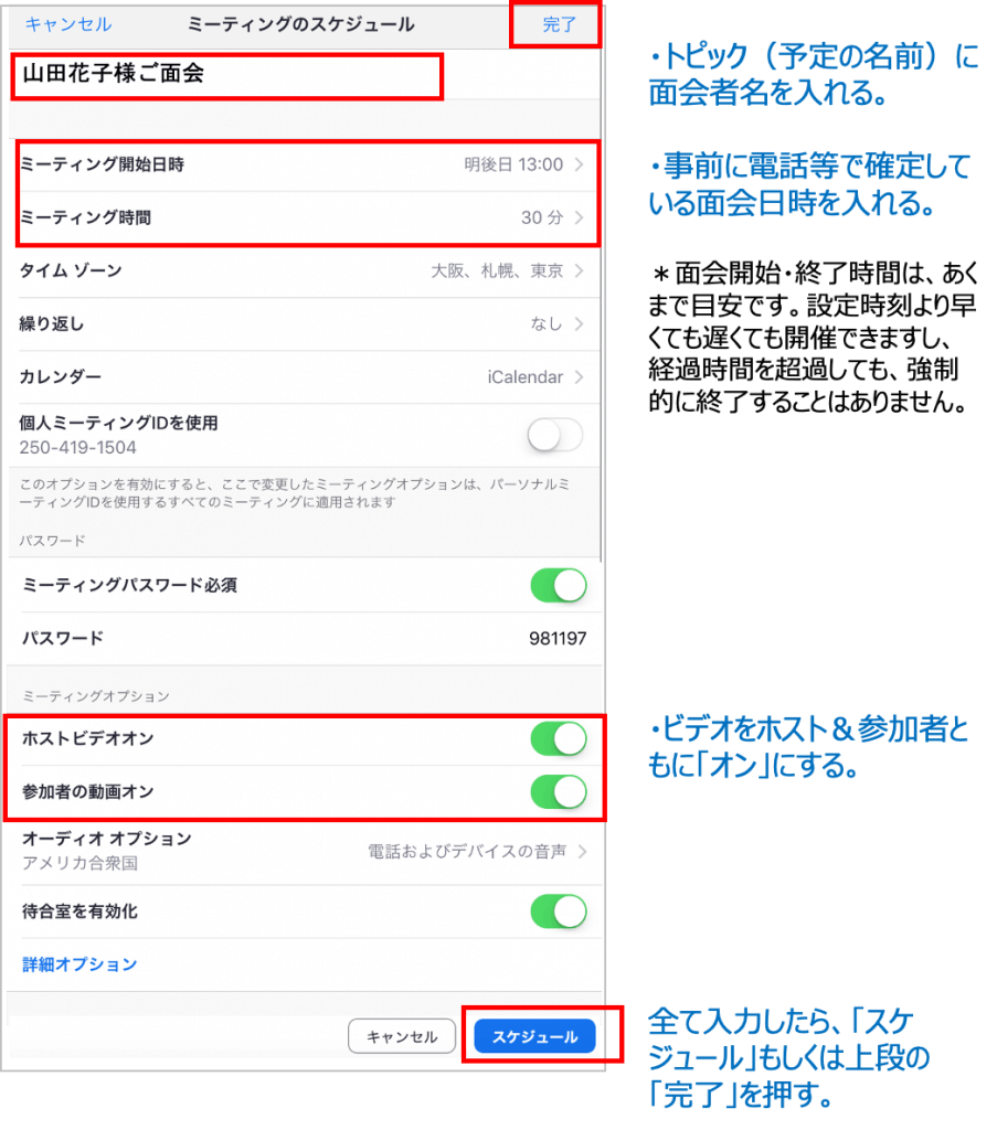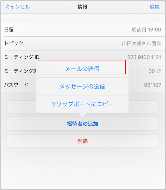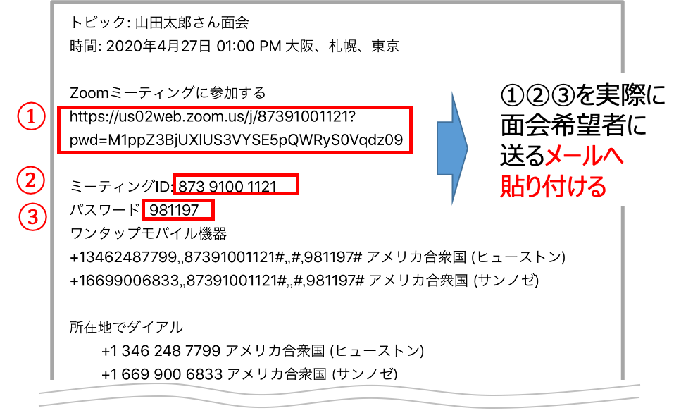 8.ズームが自動製作したメールの下書きの中から、①ミーティング用URL、②ミーティングID、③パスワードを抜き取り、面会希望者へ実際に送るメールへ貼り付ける。